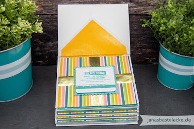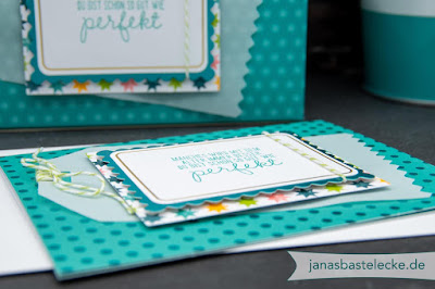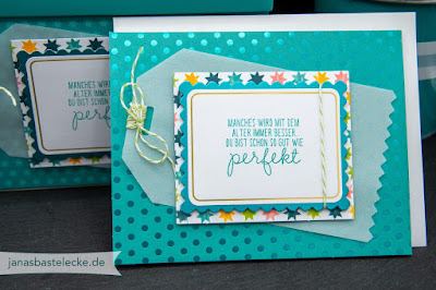 Ich hab daraus einfach ein Geburtstagsalbum gemacht, wo entweder Fotos vom Geburtstag reingeklebt werden können oder was man z. B. auch als Gästealbum verwenden kann, wenn man eine größere Feier macht. (Sobald das natürlich wieder möglich ist!) Das Album lässt sich wunderbar in der Box verstauen und so auch dekorativ ins Regal stellen. Passend dazu habe ich eine der Karten tatsächlich als Karte gestaltet.