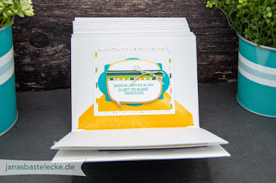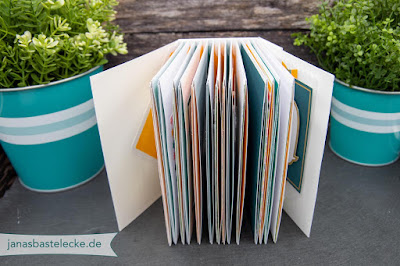Mein Projekt ist ein Minialbum aus dem Projektset „Fabelhaft“ aus dem aktuellen Minikatalog Jan – Juni 2021 (S. 7). Das Set ist eigentlich erstellt worden um damit ganz einfach 16 Karten gestalten zu können. Es kommt mit den Kartenbasen, passenden Umschlägen und ganz viel vorgestanzten Teilen um die Karten verzieren zu können. Außerdem ist noch eine gestreifte Kordel dabei und alles kommt in einer tollen, dazu passenden Box. Im Katalog sieht man direkt daneben ein passendes Stempelset und die Klebemittel und Stempelfarben, die man noch dazu bestellen kann.